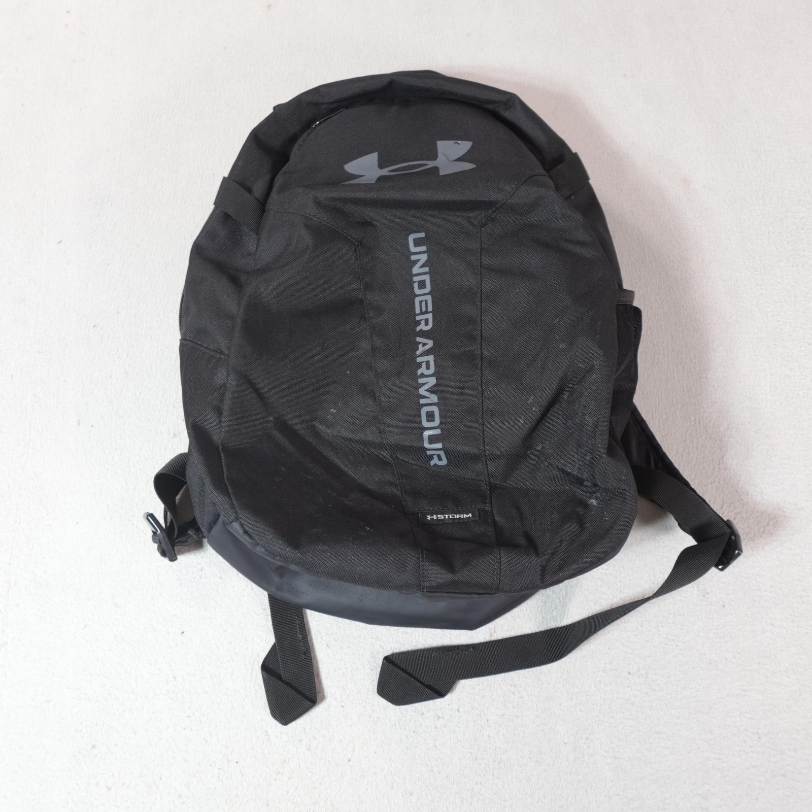 Brand: Under Armour Model: Hustle Lite backpack Color: Black with gray logos and vertical UNDER ARMOUR front wordmark Technology: UA Storm water-repellent finish (tagged "STORM") Size: / One Size (OSFA) Shell: 91% Polyester, 9% Nylon Lining: Light gray interior with a fleece-lined top valuables pocket Made in Cambodia Features: Padded shoulder straps; padded back panel; top haul handle; reinforced bottom panel; zip main compartment Interior: Large lined main compartment Labels/markings: UNDER ARMOUR front print; large UA logo; inner label reads "UNDER ARMOUR HUSTLE LITE – BUILT TO HANDLE ANYTHING"; RN 96510 | CA 41095 Notes: See photos for close-ups of condition and details.
