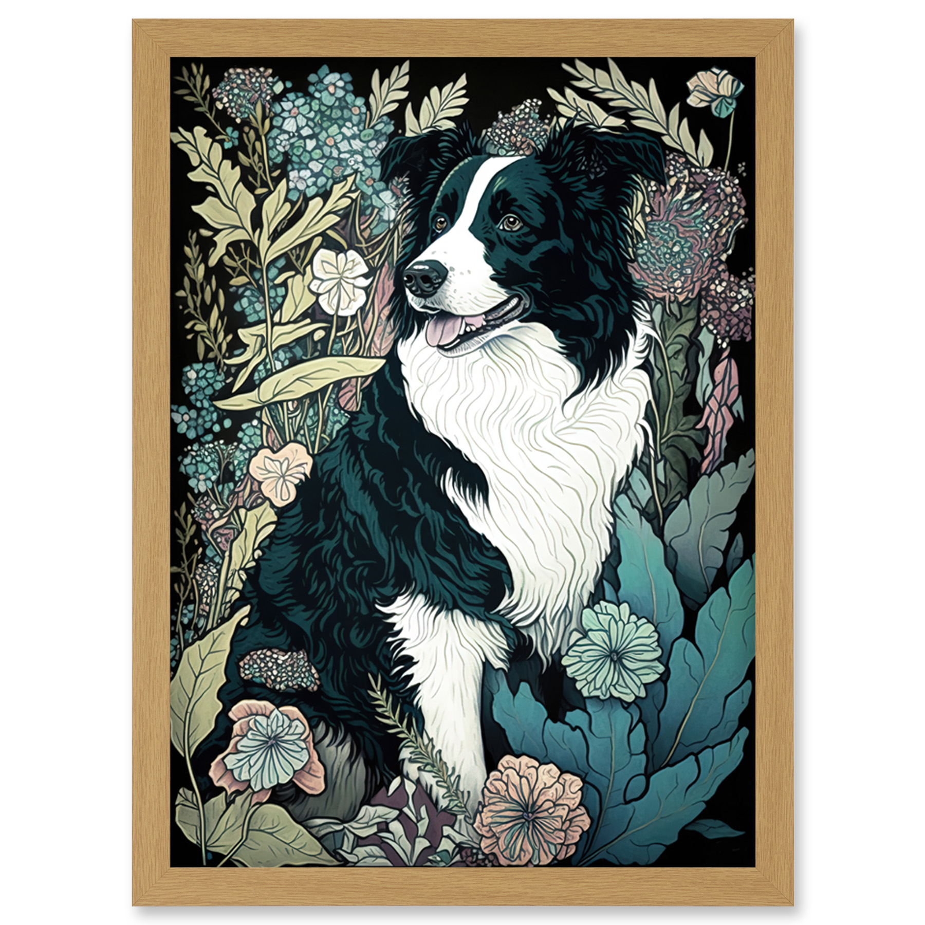 Artery8 Border Collie Dog in Wildflower Field Modern Illustration Artwork Framed Wall Art Print A4 in Light Oak Light Oak