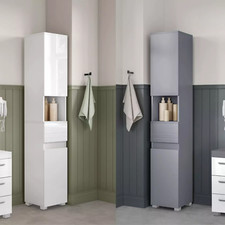 This compact and tall bathroom cabinet is ideal for small bathrooms. The tall bathroom cabinet is visually impressive with its material mix of white MDF and natural bamboo doors. Tall White Cupboard for the Bathroom.