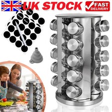 20 empty jars with labels and a funnel. 360° Rotating Spice Rack Organizer . - Durable stainless steel and thick glass jars. Transform your kitchen with our sleek and functional spice rack! - 20 jars (9.5cm x 4.5cm each).