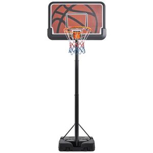 Highlights: Reinforced Backboard & Rim For Better Performance Selected Materials For Indoor/Outdoor Play Fillable Base On Wheels Height-adjustable For Teens & Adults Handy Basketball Storage Assembly Required Quick overview: Suitable for everything from cultivating your children's interest in basketball to practicing your shooting skills, this portable basketball hoop system will provide you and your children with a professional yet cost-effective backyard court solution. Thanks to the telescopic poles, the rim of this basketball goal can climb up to 3.03 m regulation height or lower down to 2.28 m for younger players. The 2 wheels on the fillable base make it easy to maneuver despite its weight. You can use it in the backyard, driveway, or an indoor basketball court. Moreover, the built-in basketball storage on the base and an extra basketball net provide more convenience during use. Constructed of a powder-coated metal stand, a 110 cm wide PVC backboard and all-weather nylon nets,