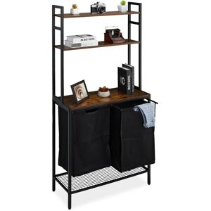 Store your dirty laundry neatly until the next wash cycle. 2 pull-out laundry baskets allow you to pre-sort dirty laundry, while a shelf provides additional storage space for towels, detergent and much more. Thanks to the 4 castors and locking brakes, you can easily transport the laundry collector to the washing machine. The industrial design makes the practical combination of laundry sorter and bathroom shelf an eye-catcher in your bedroom or bathroom. Laundry basket shelf in detail - Dimensions H x W x D: approx. 75.5 x 80 x 33 cm / approx. 6.9 kg - Shelf area W x D: approx. 76 x 33 cm - Load capacity: max. 25 kg - Capacity per laundry bag: approx. 49 litres - Material: MDF, polyester, iron - Colour: Black, dark brown Laundry cupboard in industrial design - Space-saving combination of shelf and laundry storage - Includes storage space for towels, decorations and detergent - With two pull-out laundry baskets made of black fabric - Industrial design piece of furniture for the bathroom
