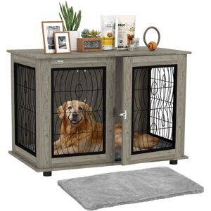 A secure PawHut cage fused with a side table your dog has a comfortable spot to rest, whilst you have a spacious and stylish tabletop to display your favourite pieces the two colours of grey and white will fit in well with your home dcor. Your pet will have a front door for easy access and there's a lock, so they'll will remain put the steel bars keep them secure and gives you a 270 degree view so you can keep watch. Made from particle board, it's durable and can be used daily.