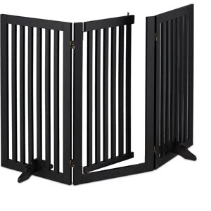 Secure the dangerous places in your household with this large barrier. There are many places that should remain inaccessible for small children or pets, such as stairs, chimneys or passages without doors. With the foldable protective grille, you can react flexibly to such potential hazards. The wooden grille is quick to set up and can be folded as required thanks to the hinges. If necessary, you can easily dismantle the barrier again and store it in a space-saving way. Please note the size of thegrid spacing when using the barrier grid. Barrier fence in detail - Total height: approx. 92 cm - Dimensions per section H x W x D: approx. 92 x 51 x 2 cm - Grid spacing H x W: 81.5 x 3.6 cm - Material: MDF - Colour: Black 3-piece safety gate - Max. width: approx. 154 cm - Folded H x W x D: approx. 92 x 51 x 5.5 cm - Weight: approx. 10.5 kg 4-piece safety gate - Max. width: approx. 206.5 cm - Folded H x W x D: approx. 92 x 51 x 8 cm - Weight: approx. 14.2 kg Stair guard for dogs andchildren