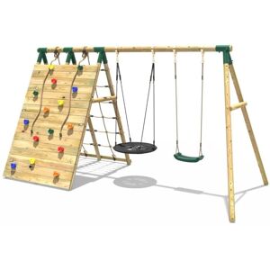 NOTE: This item is constructed of natural wood and it may split or crack, this does not affect the structure or strength of the item, even if there are cracks in the wood on delivery this is completely normal and will not affect the strength and durability of the product. Can you beat the wall? This fun new twist on the classic climbing frame from Rebo comes with a double width climbing wall on one side and double cargo nets on the other allowing kids to challenge friends to see who can make it up and over the wall first. There will be bragging rights at stake here, this is going to get serious! Available with either a single or double swing arm Rebo’s new Beat the Wall swing set could just be the most fun addition you add to your garden this year. And for even more play value why not add Rebo’s Add on wooden platform with 6ft slide or Rebo’s Basketball net for round wood swing sets to make this an all in one play centre! Constructed of pressure treated timber Rebo wooden garden swing